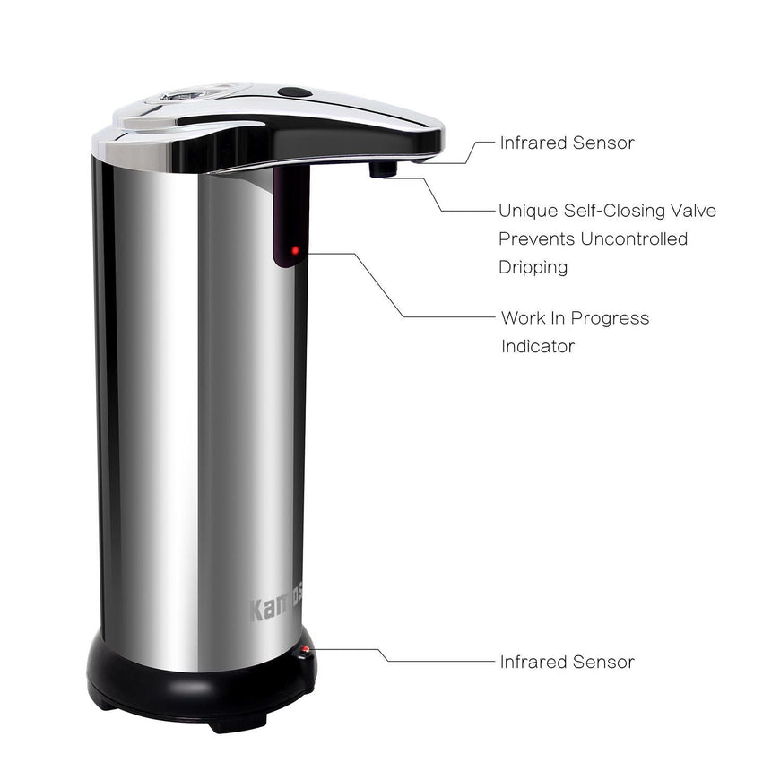 Prevazut cu LED pentru a indica functionarea si cu semnal sonor atunci cand este utilizat. Usor de folosit de catre oricine, poate fi alimentat cu orice tip de sapun lichid, detergent lichid de vase, gel dezinfectant, etc.