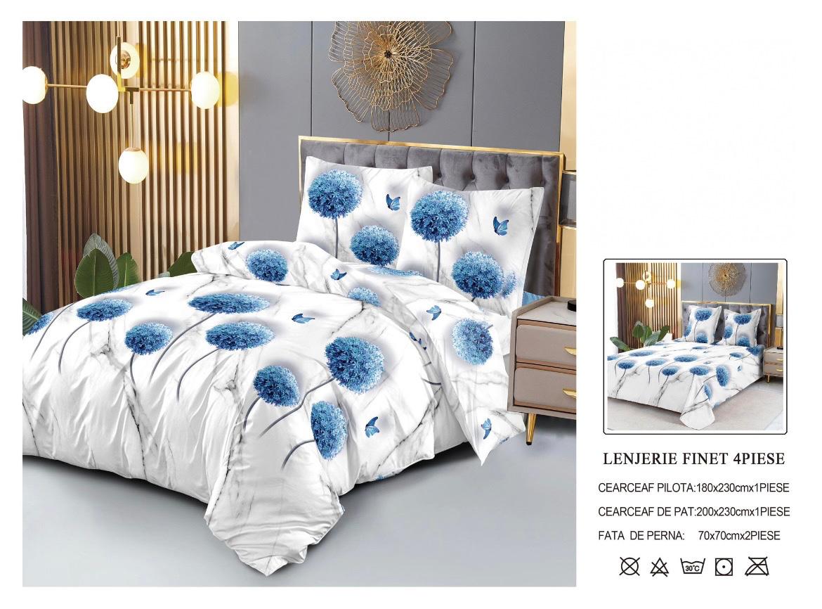 Lenjerie de Pat Finet Bumbac – 4 Piese – Model Floral Albastru cu Accente de Fluturi