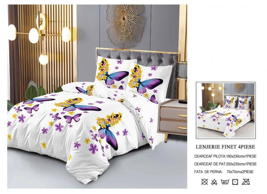 Set Lenjerie de Pat Finet Bumbac 4 Piese – Model Fluturi și Flori