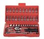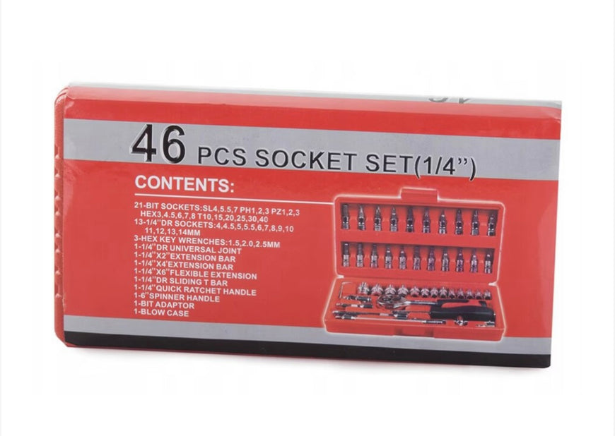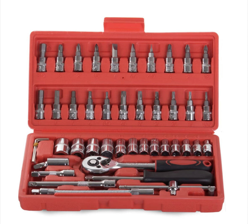 ✔ Trusă chei tubulare și șurubelnițe (46 piese) – include unelte rezistente, depozitate într-o valiză compactă și organizată, ideală pentru reparații casnice sau profesionale