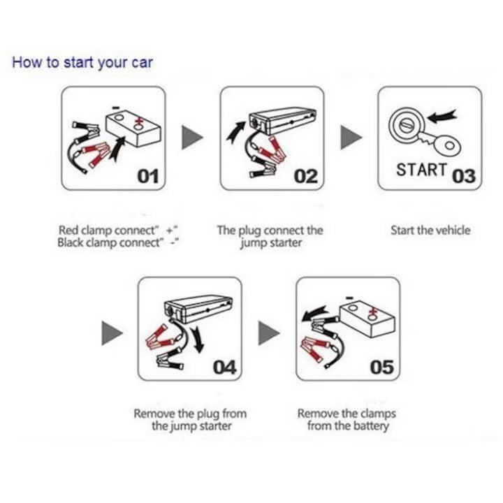 Funcții: Iluminare LED, lanternă, protecție scurtcircuit, protecție supradescărcare, asistenta pornire