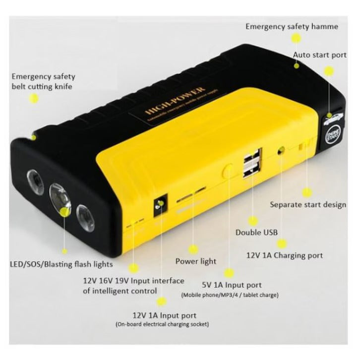 Fiți pregătit pentru orice situație cu Jump Starter-ul portabil cu capacitate de 60800 mAh, un dispozitiv multifuncțional care combină funcțiile de pornire auto, power bank și lanternă de urgență. Ideal pentru șoferi, pasionați de aventuri sau oricine are nevoie de o sursă de energie mobilă și fiabilă, acest dispozitiv vă oferă siguranță și confort în orice circumstanță.