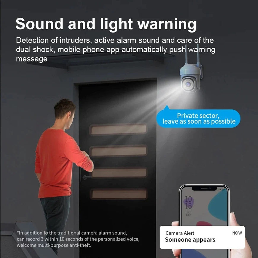 Tot in momentul detectiei miscarii, camera emite diferite sunete sau mesaje (utilizatorul va stabili acest lucru din aplictie). Aceste sunete sau mesaje vor fi emise la volum ridicat si sunt de genul unor alarme sonore sau mesaje de tipul ”Va rugam parasiti zona".