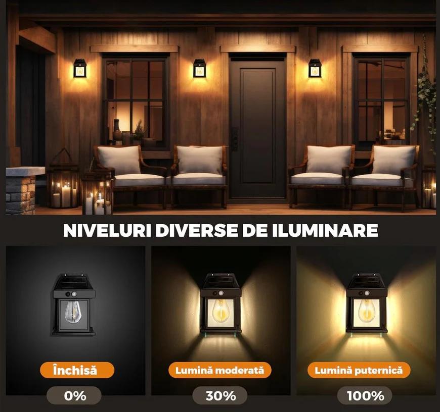 Fiecare lampă are 3 moduri de iluminare și dispune de senzor de mișcare sensibil (unghi 120°, distanță de detectare 1–3 m), oferind siguranță și confort în întuneric. Carcasa este realizată din materiale ABS și PC rezistente, cu protecție IP65, ceea ce le face impermeabile și rezistente la ploaie, furtuni, zăpadă și temperaturi extreme.