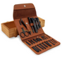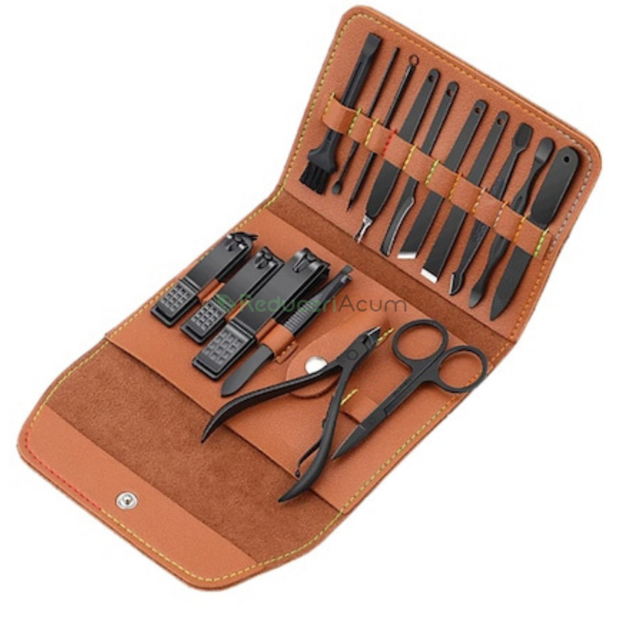 Acest kit de manichiura profesional contine 16 instrumente intr-o trusa din piele ecologica de lux si convenabila.
